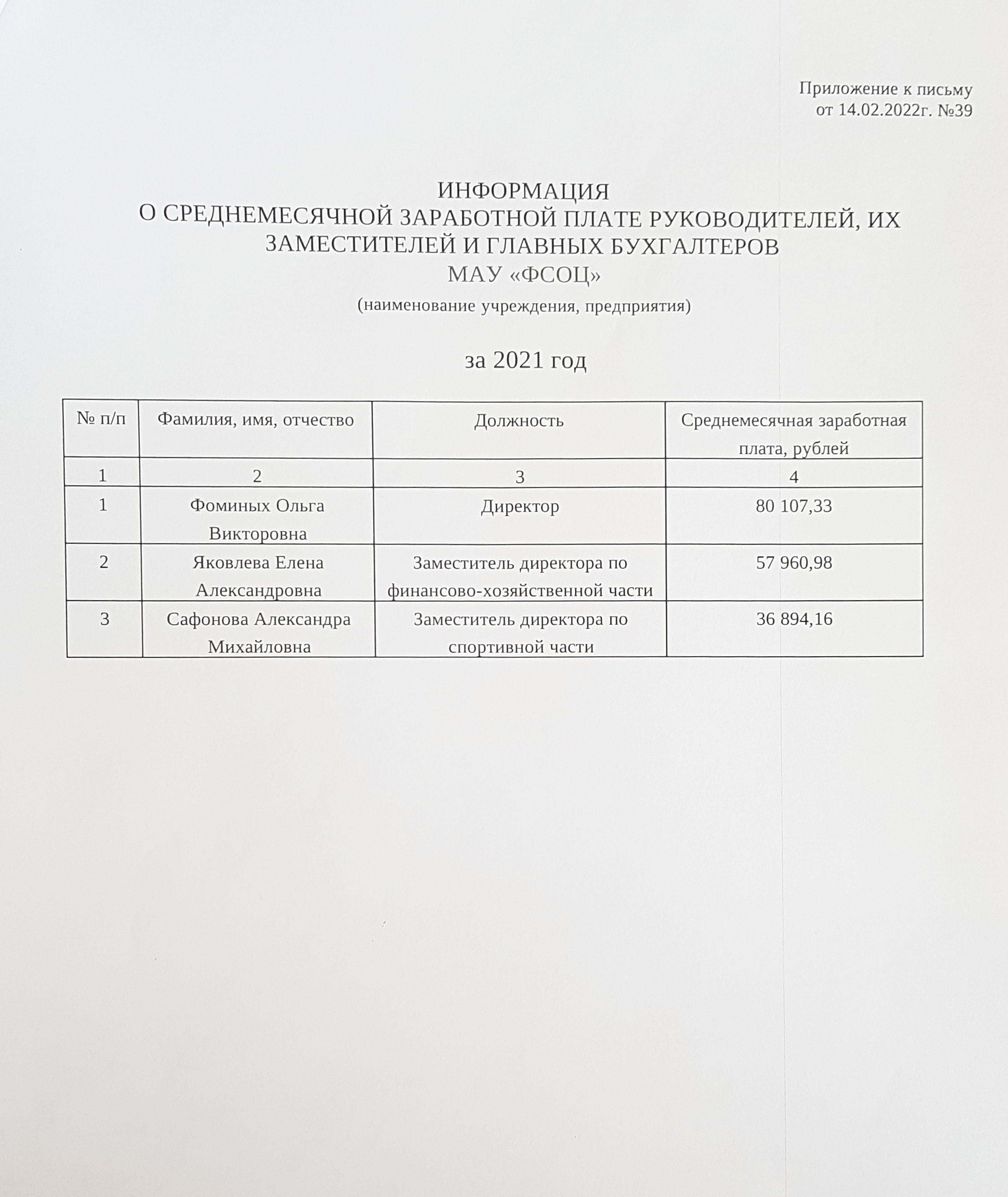 Информация о среднемесячной заработной плате руководителя МАУ ФСОЦ, их заместителей за 2021 год