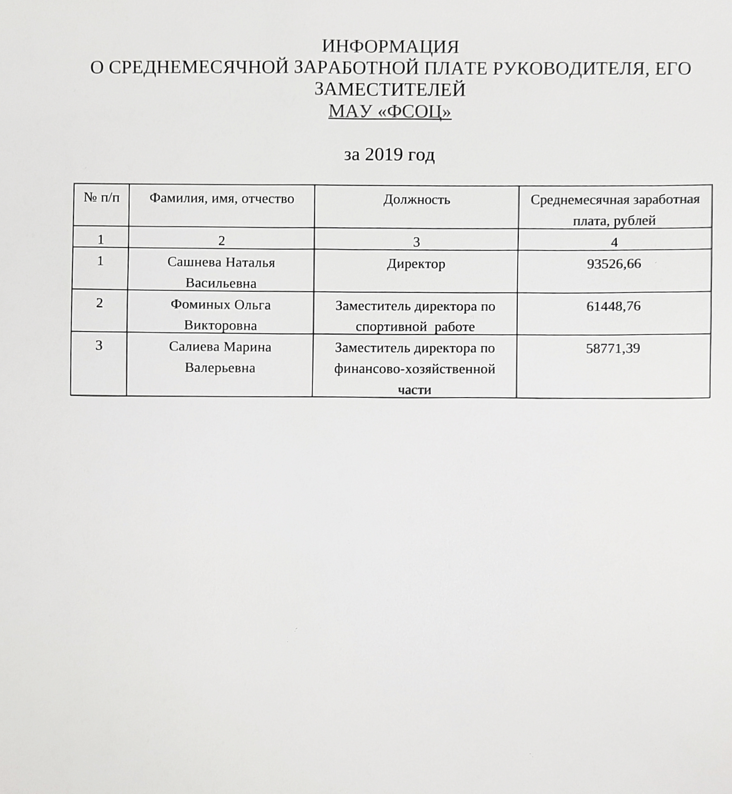 Информация о среднемесячной заработной плате руководителя МАУ ФСОЦ, их заместителей за 2019 год